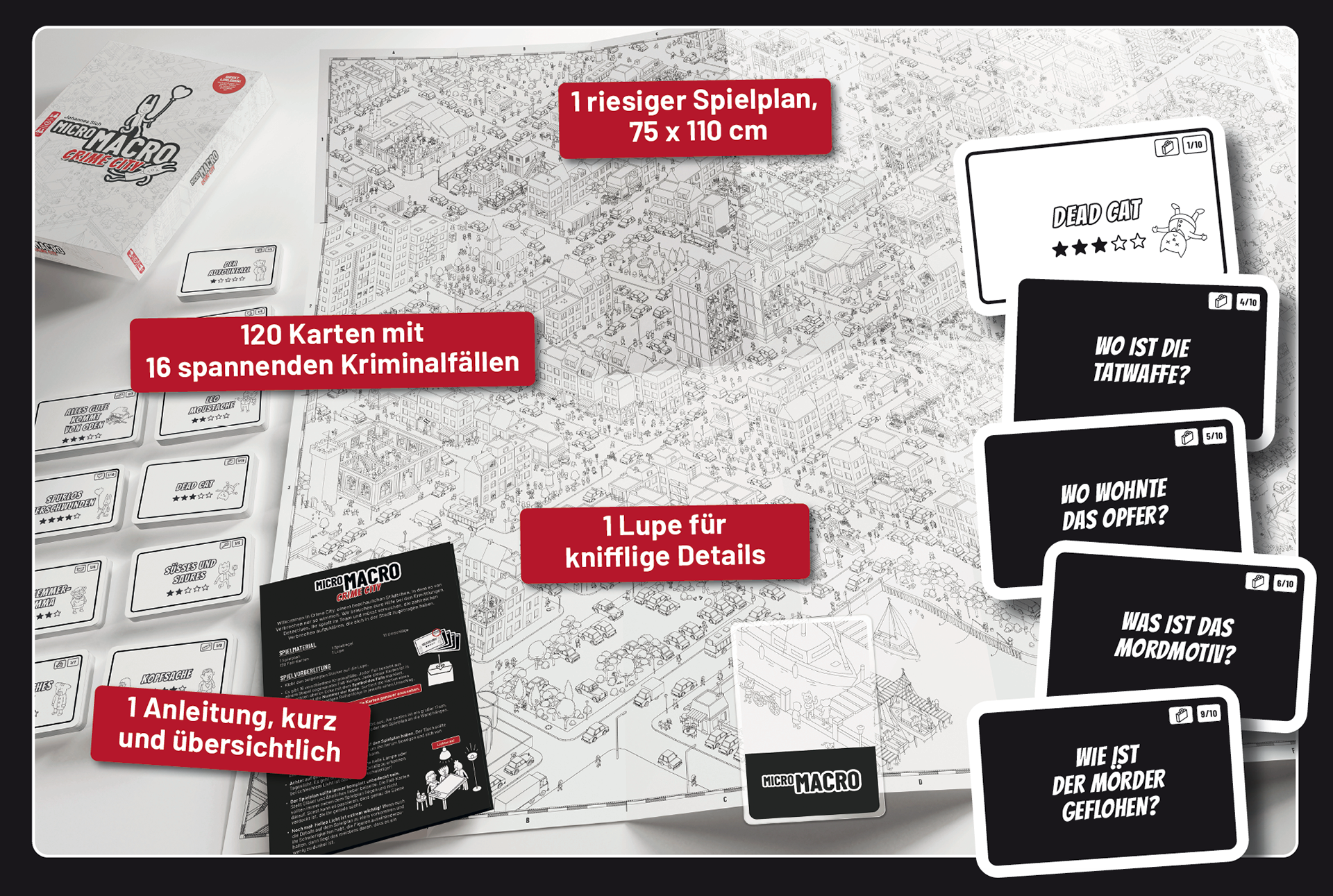 In collaboration with Daniel Goll and Tobias Jochinke, teaming up as "Hard Boiled Games" studio, we developed and designed "MicroMacro - Crime City".